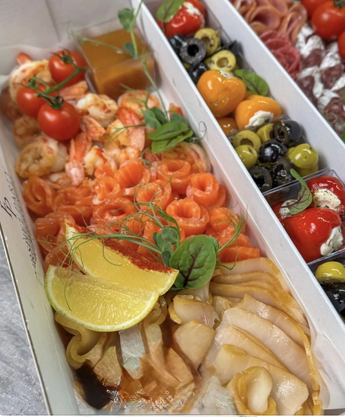 Премиум-ассорти из морепродуктов и мясных деликатесов. Состав; 5 видов колбас С/с форель Масляная рыба Креветки Красная икра Маслины/оливки Фаршированные перчики