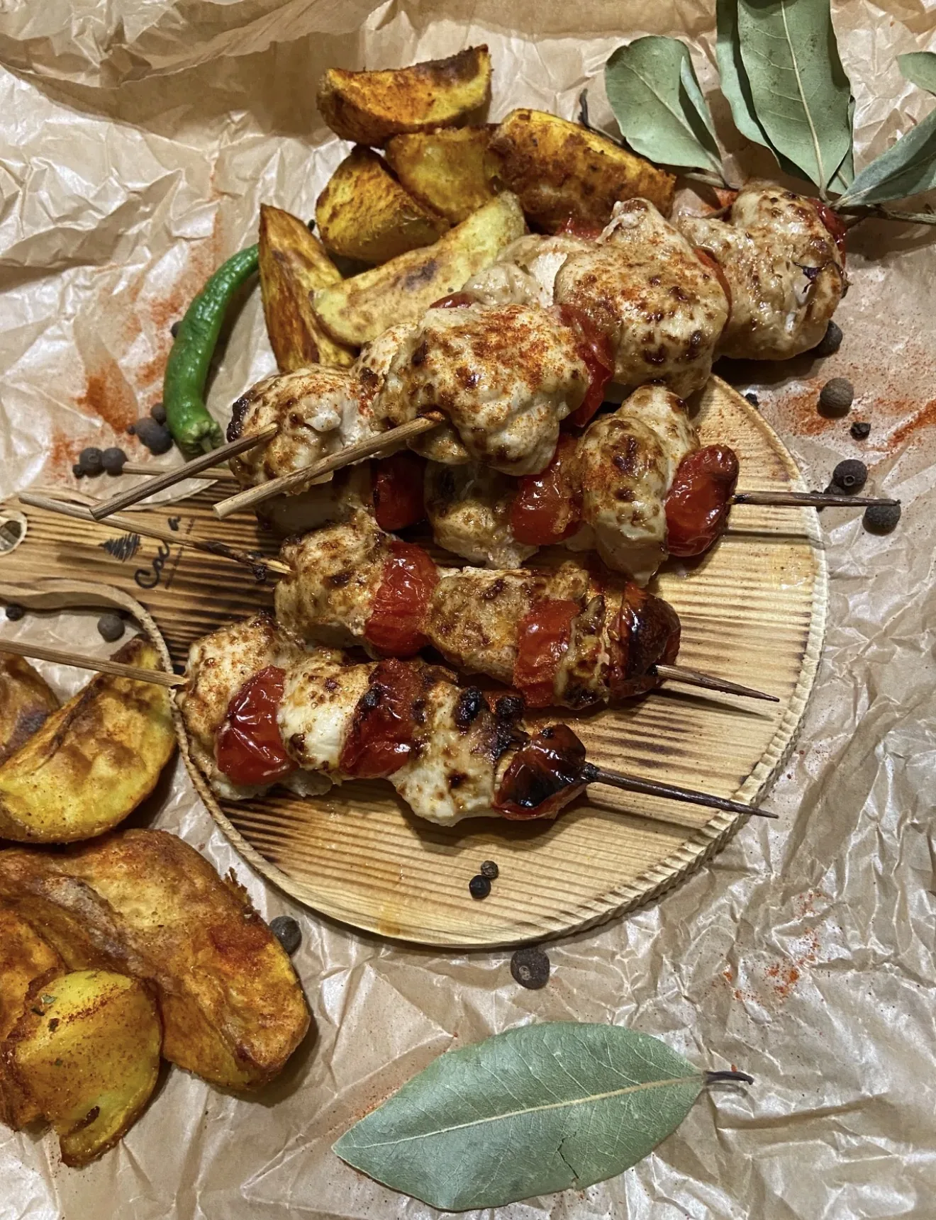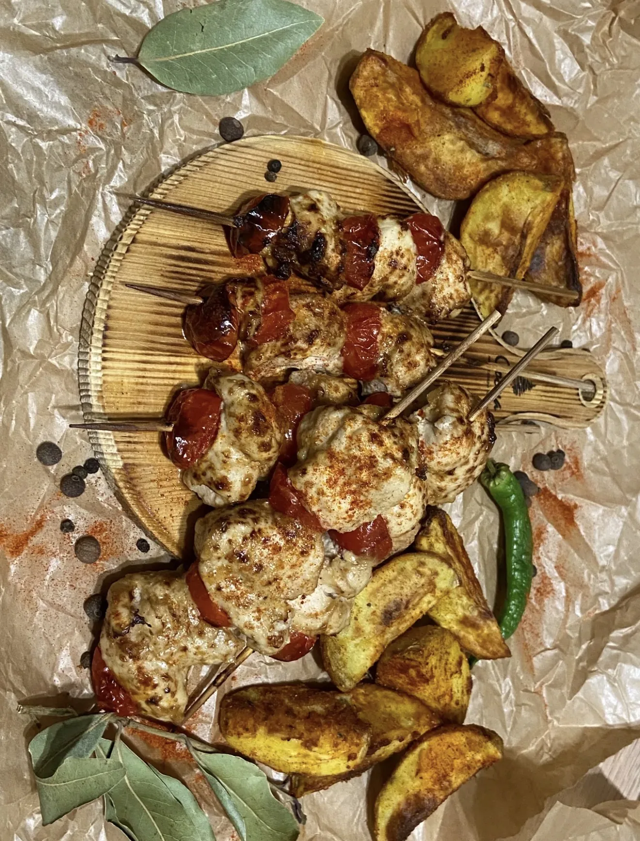 Вкусный нежный куриный шашлычок. Филе куриное . Помидоры черри. Или 🌶️ с перцем . Маринад, специи . Порция 16 шт