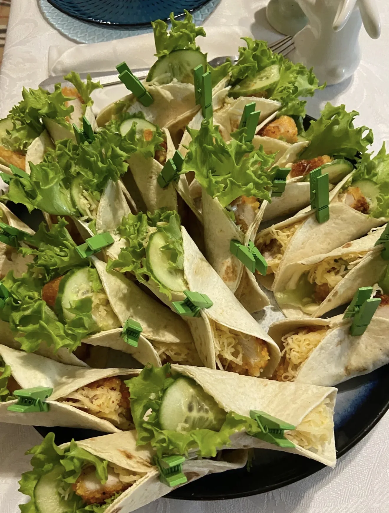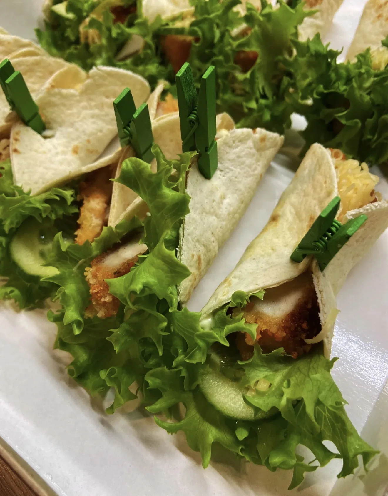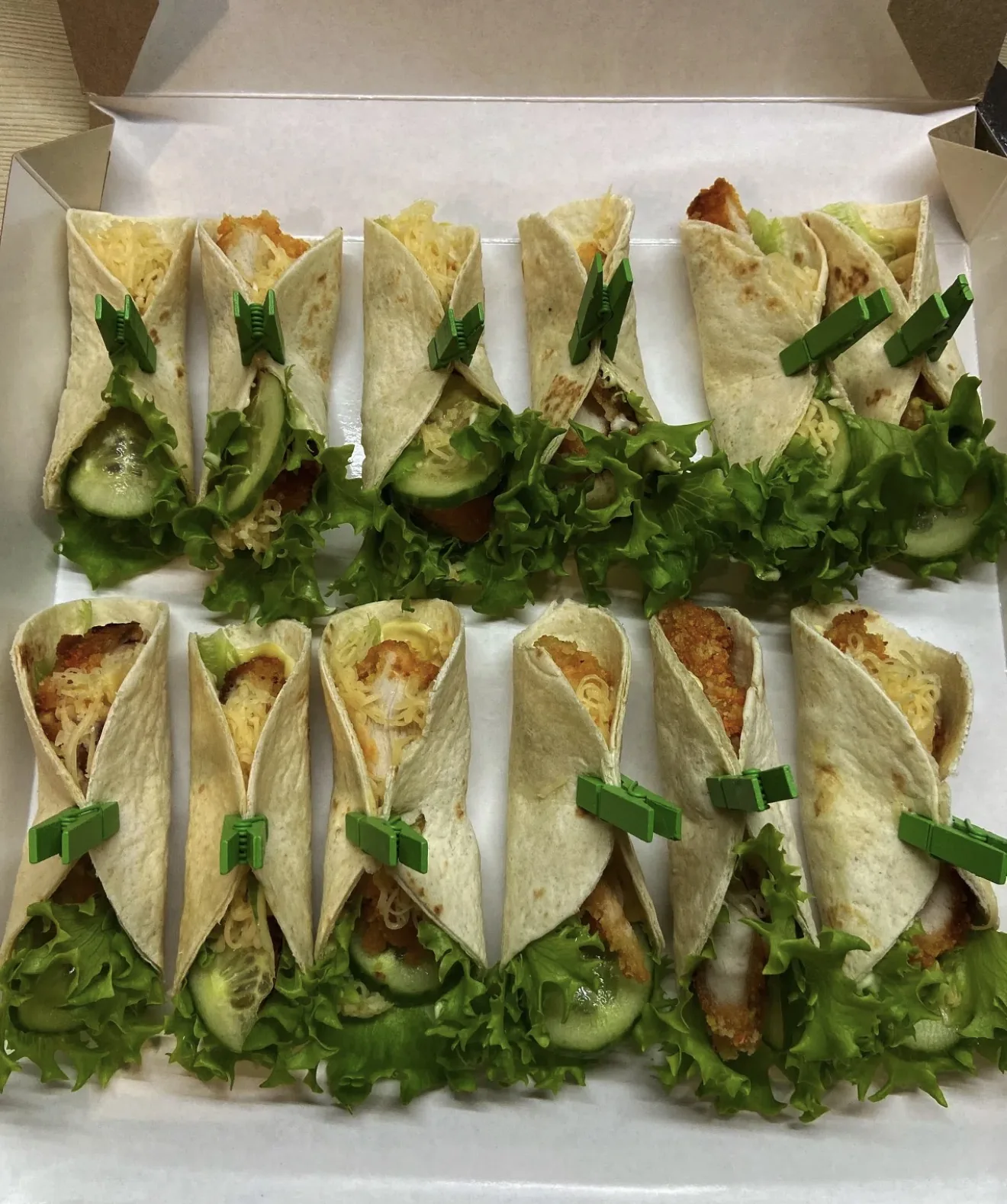 Бугульма 20 штук . Состав: Тортилья , соус горчица майонез, лист салата, курица в хрустящей панировке,огурец, сыр Гауда, прищепка.