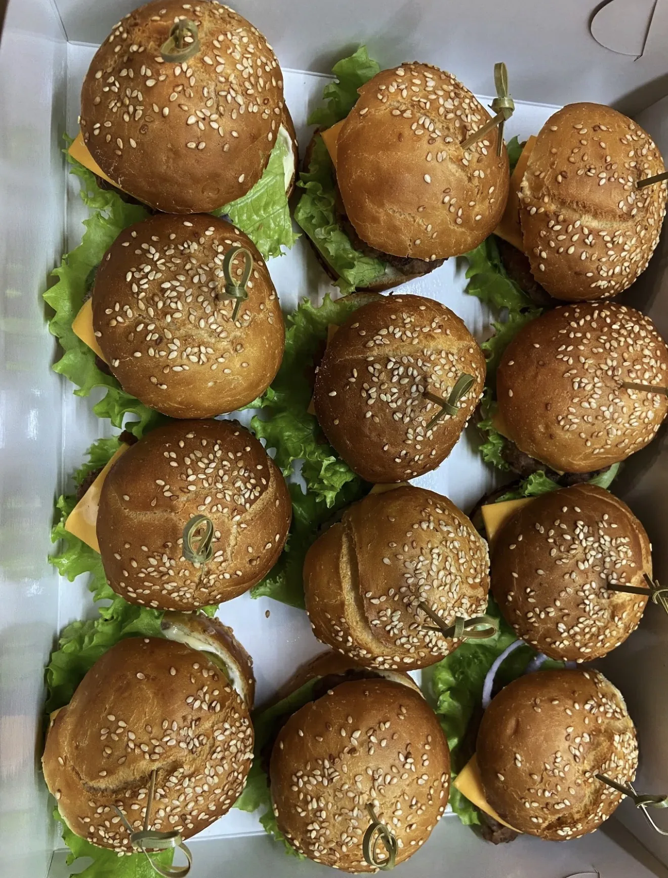 Мини-бургер Состав: • булочка домашняя с кунжутом • котлета свинина курица • сыр ЛОМТИК • маринованный огурчик • помидор • соус для бургеров/кетчуп томатный горчица • лист салата . Лук красный Заказ от 6 Шт. Цена указана за 6 шт.