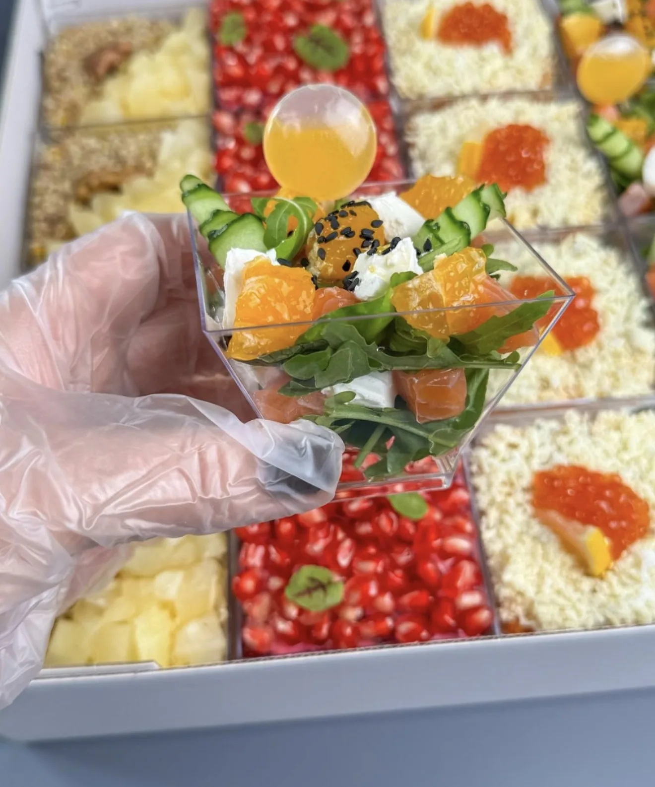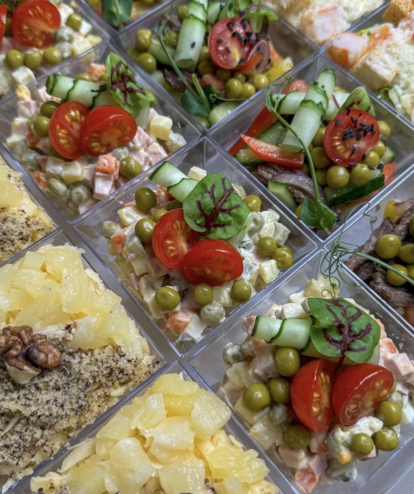 Порционные салаты 4999-7600₽ • с говядиной и овощами • с запеченной курицей и ананасом; • цезарь с креветкой; • с мандарином и красной рыбкой. • крабовый салат • оливье • мимоза с форелью • гранатовый браслет • сельдь под шубой 16 салатов — 4999₽ 25 салатов- 7600₽ Креманки 150 мл. Выберете количество