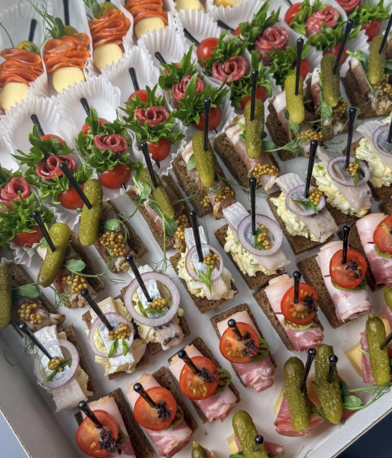 Бокс «Под градус» maxi 5850₽ В данном боксе 60 канапе. Рассчитан на большую компанию. Закуски подходят под крепкий алкоголь.