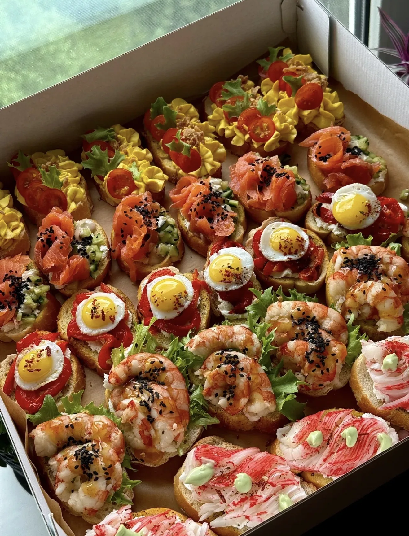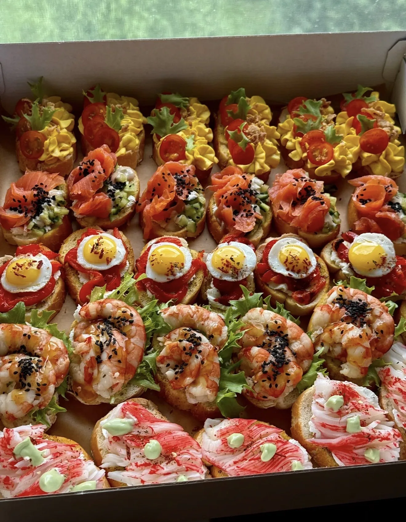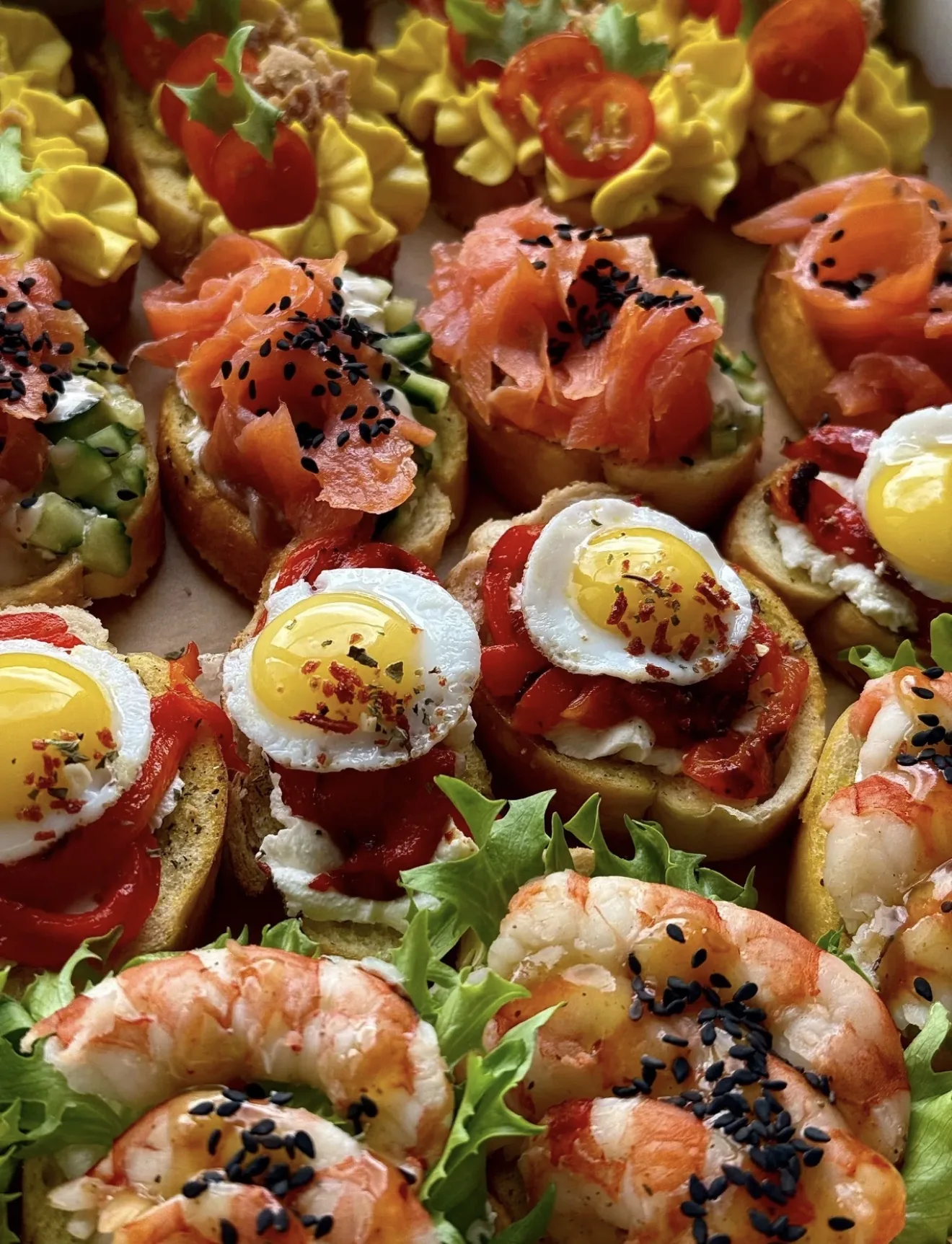 🔥 Что внутри: • 🧈 Брускетты с нежным яичным муссом помидорками черри и хрустящим салатом. • 🐟 Лосось, сливочный сыр, свежий огурчик и немного кунжута — классика, которая всегда в точку. • 🍳 Перепелиные яйца с печёным перцем и мягким сыром — выглядят круто, а вкус ещё круче. • 🦐 Сочные креветки с соусом и чёрным кунжутом — тут без комментариев, фаворит у всех. • 🦀 Крабовые палочки, немного соуса васаби и зелени — для любителей морских нот.