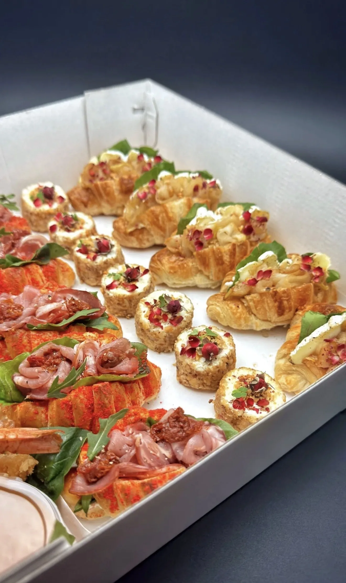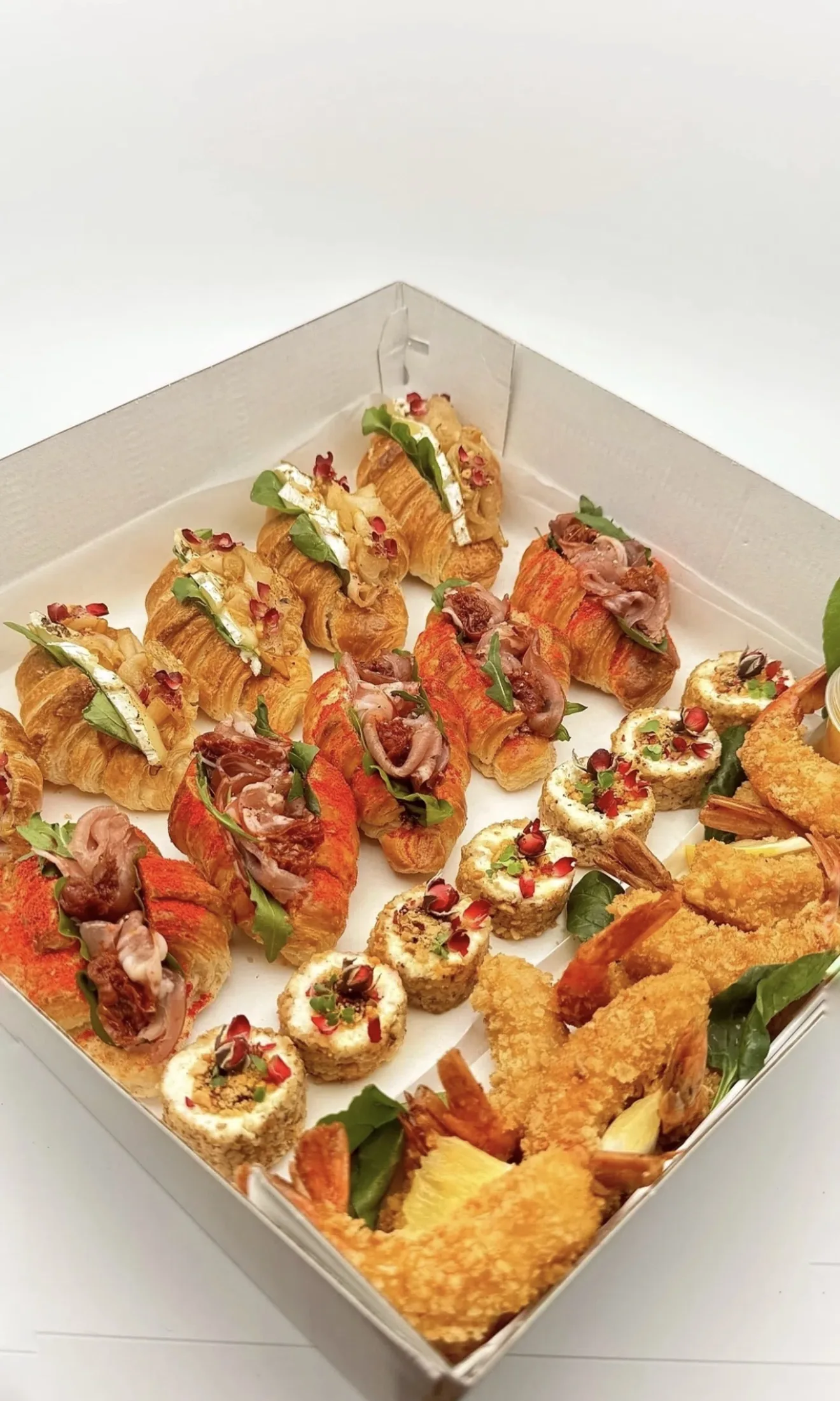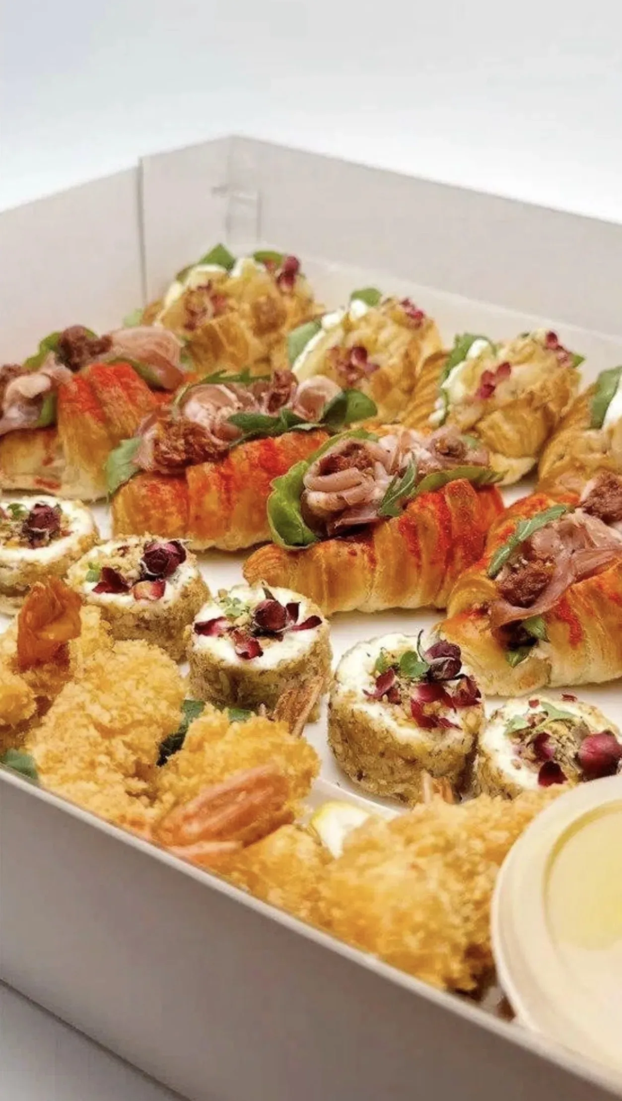 Десертный сыр Бюш с вишней 7 шт Круассан мини с хамом и зеленью 5 шт Круассан мини груша с камамбером 5 шт • Креветка панко 15 шт , Соусы
