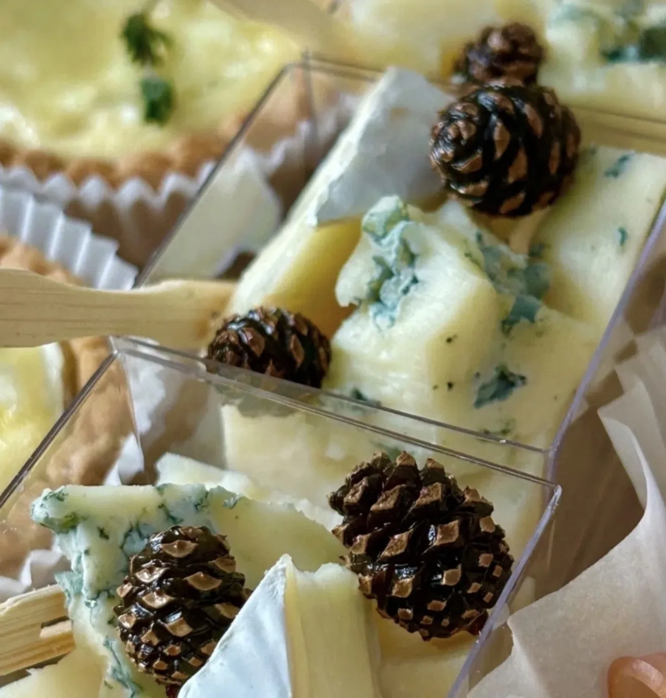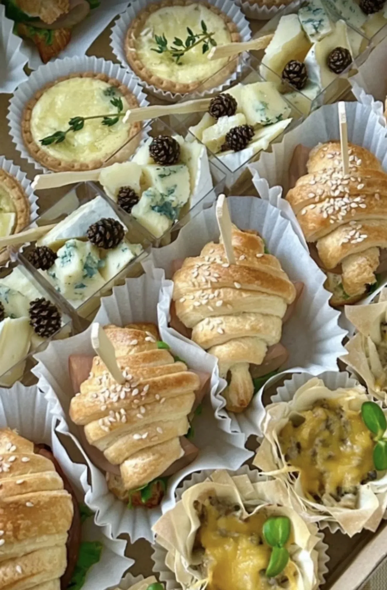 -Круассан с индейкой 10шт -Мини киш 4 сыра 5шт -Порционное сырное ассорти 6шт мёд а -Хрустящие корзинки фило с жульеном 6шт Бокс рассчитан на 5-6 персон Узнавайте заранее , шишки могут закончиться .