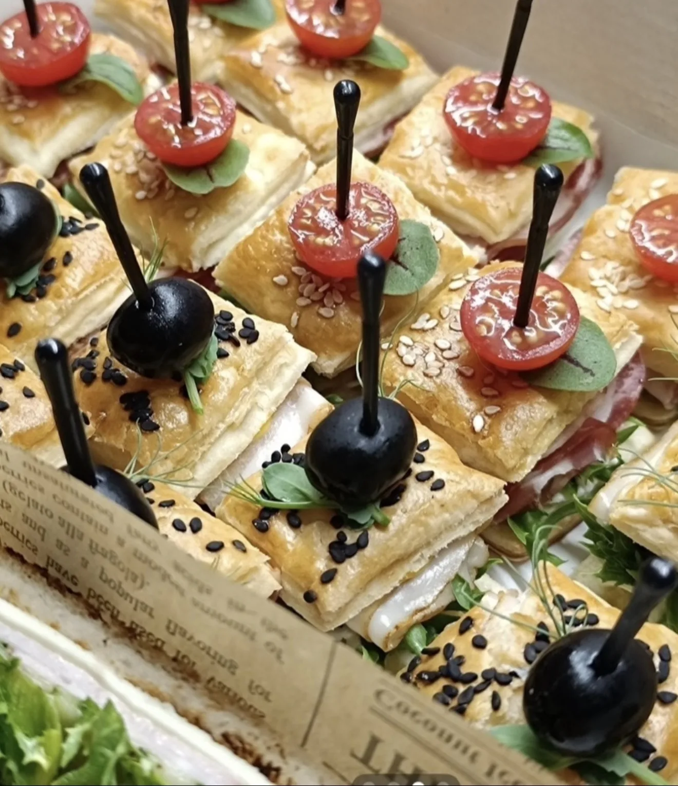 « Состав бокса: - канапе: форель, огурец, крем-чиз 10шт - канапе: грудинка, соус, вяленый томат 10шт - канапе: балык, сыр, крем-чиз, огурец 10шт Итого: 30 шт. Размер бокса: 25*25